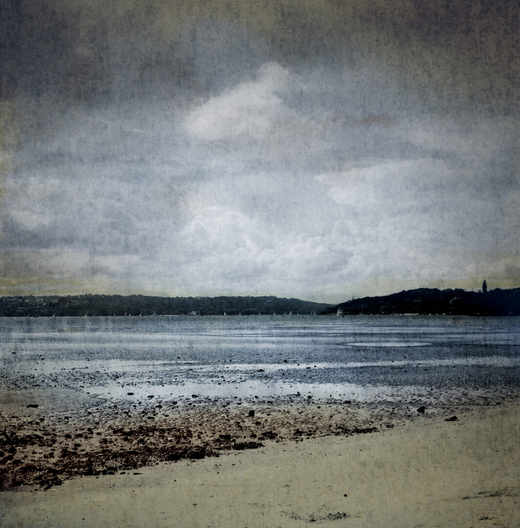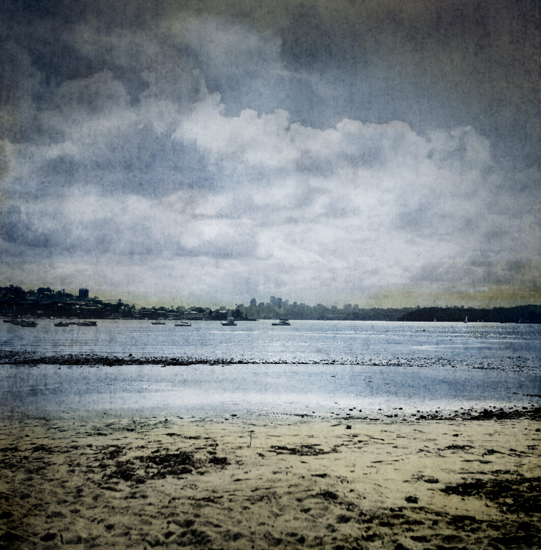 futurperfekt : anderswo: bondi beach märz 2019, analoge mittelformatkamera, film entwickelt jänner 2025, 89,5 x 89,5 cm, s/w barytpapier auf alu, handcoloriert, unikat